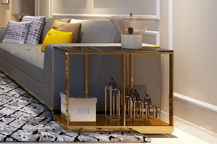 在家具的選擇上,并沒有出現(xiàn)碎花布藝等美式元素,而是選擇了純灰色系沙發(fā)搭配線條利落的古銅色茶幾,讓自然與清新之中不失現(xiàn)代的質感簡約。