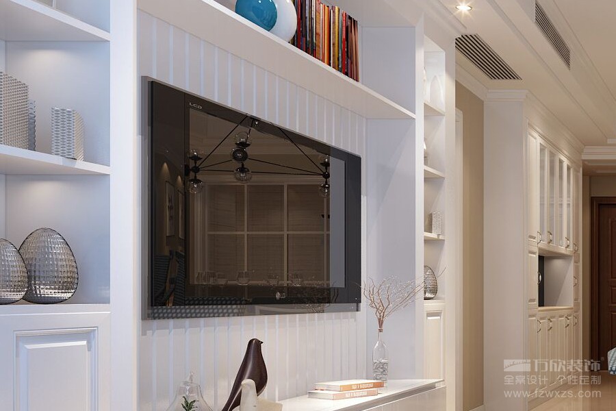 電視背景墻采用一整墻定制的白木柜,屋主收藏的裝飾品被整齊的擺放在壁龕中,不論是精致的擺設還是看似隨意的點綴,都讓這里散發(fā)著安靜美好的迷人氣息。