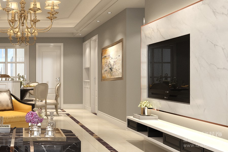 電視背景墻無過多造作,一整墻大理石紋理清晰,簡單中盡顯大氣質(zhì)感。架高的小臺面方便放一些花草、雜志或裝飾畫等,細節(jié)處處體現(xiàn)用心。
