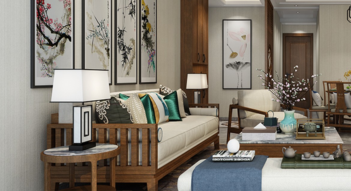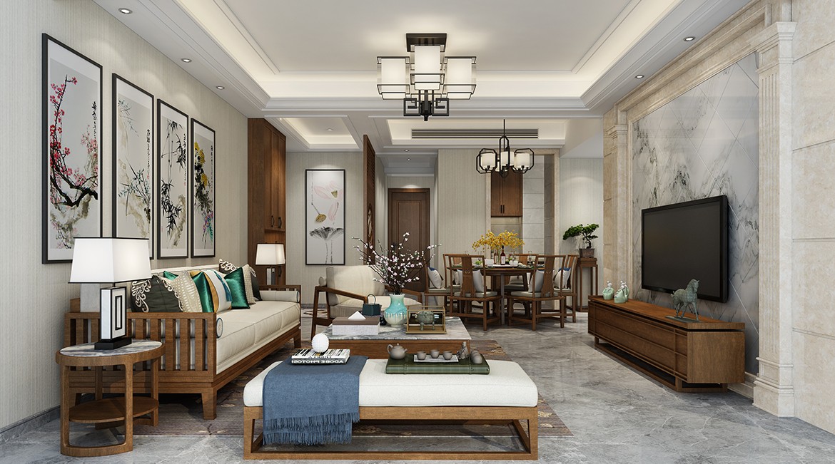 客廳綴以花和竹子元素背景,營(yíng)造出空靈的寫意,讓人心曠神怡。一抹盎然綠意讓空間瞬間鮮活起來(lái)。沙發(fā)木色襯以幽深清冷的墨綠茶托,不經(jīng)意間帶出一份屬于古代文人的高雅韻味。
