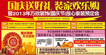 查看詳情正所謂“金九銀十家裝熱”,國(guó)慶期間迎來(lái)了2013年又一個(gè)裝修熱潮。據(jù)悉,萬(wàn)欣裝飾將于10月2 - 6日推出一場(chǎng)“國(guó)慶送好禮,裝家歡樂(lè)購(gòu)”的活動(dòng)。作為引領(lǐng)福建高品質(zhì)家裝的優(yōu)質(zhì)企業(yè),萬(wàn)欣裝飾已經(jīng)為榕城業(yè)主準(zhǔn)備了屬于自家戶型的家裝預(yù)案,傾情送出國(guó)慶裝修好禮,即將拉響福州秋季裝修的領(lǐng)軍號(hào)角。