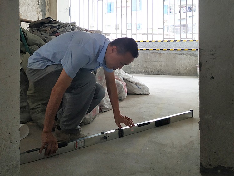 △鋪貼金剛板或者實(shí)木地板,需先對(duì)地面做好找平。用2M靠尺對(duì)各個(gè)找平空間進(jìn)行檢查,避免后期安裝地板時(shí),不平整將會(huì)導(dǎo)致地面產(chǎn)生異響,也將影響地板使用壽命。